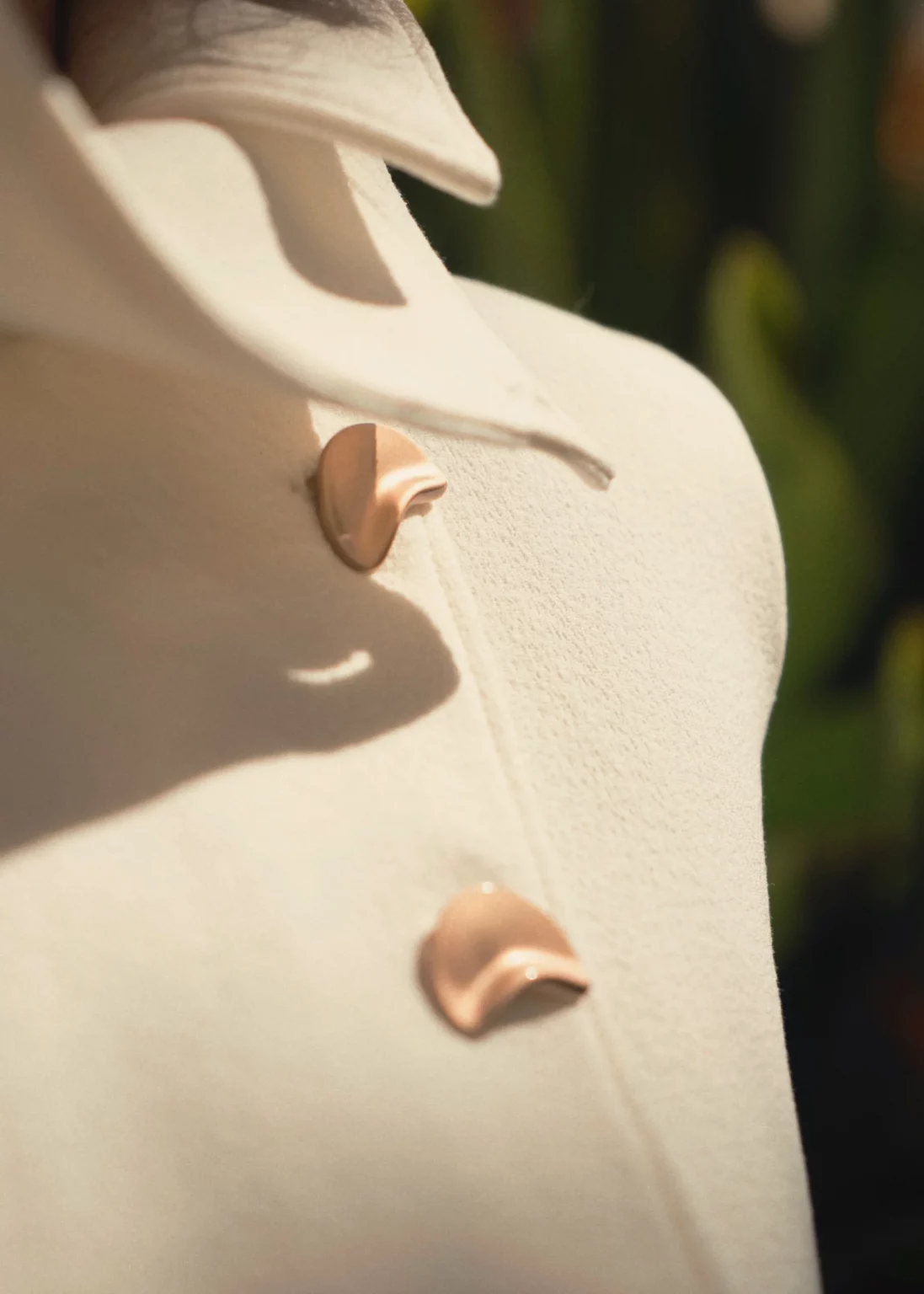 Chaleco de líneas rectas confeccionado en crepé de viscosa y algodón, con cuello alto multiposición y acabado irregular que aporta carácter y modernidad. El cierre lateral con botones joya en forma de media luna, emblema del drop, añade un detalle distintivo y elegante.
