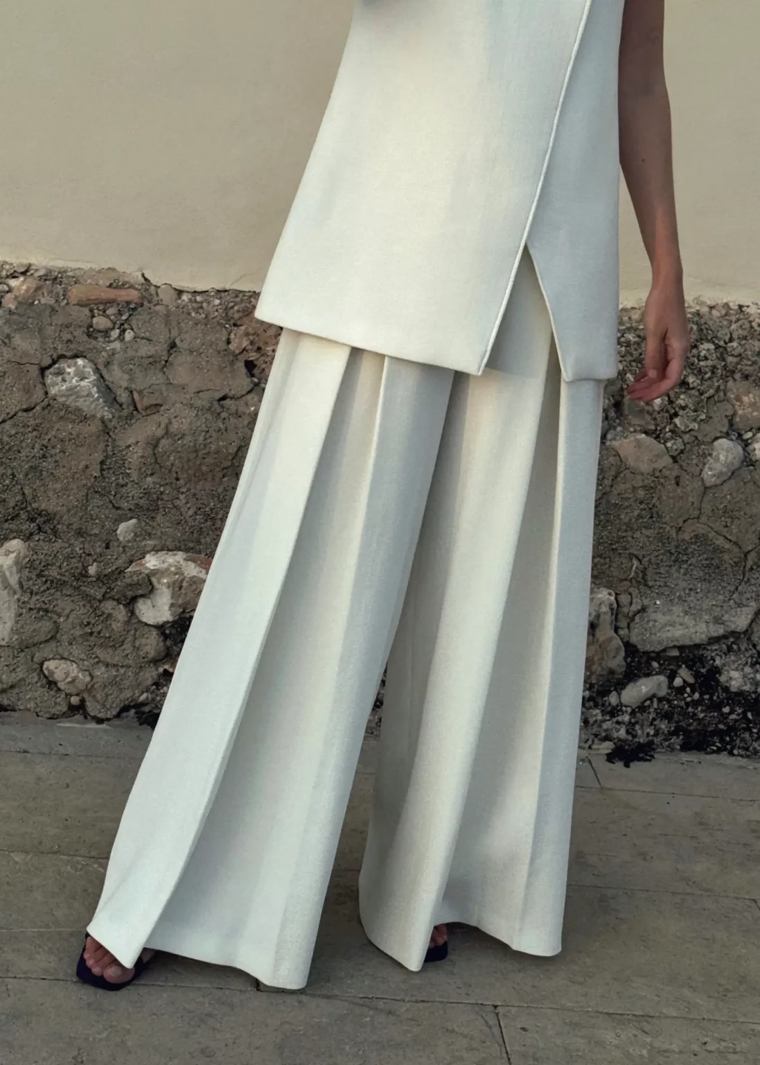 Pantalón de pinzas confeccionado en crepé de viscosa y algodón, que garantiza caída fluida y comodidad. Su corte de sastre moderno estructura la silueta sin perder movimiento, ofreciendo una elegancia contemporánea y versátil.